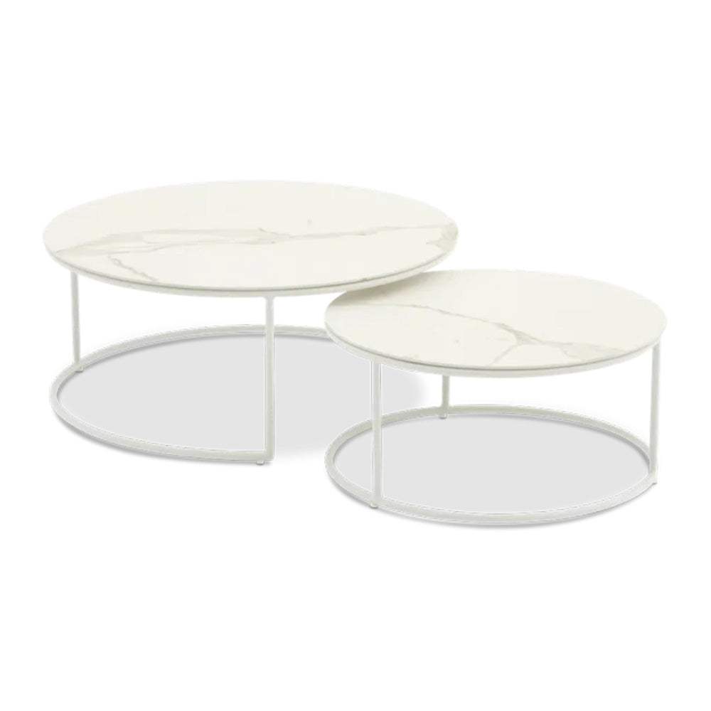 • Set of 2 Tables: Includes two matching round ceramic-top coffee tables, ideal for versatile placement or layered styling.