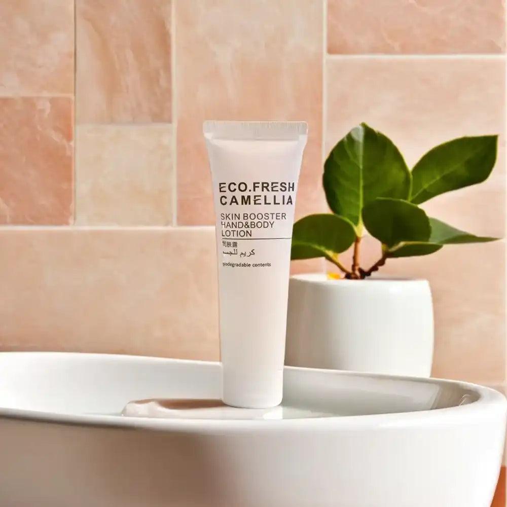 Experience the opulence of Camellia Hand & Body Lotion, designed to captivate the senses with its enchanting floral aroma. Ideal for the demanding standards of hotel services, this premium lotion, encased in a flip-cap tube, provides convenient portability, ensuring skin rejuvenation with the luxurious essence of Camellia. A compact companion for on-the-go freshness.