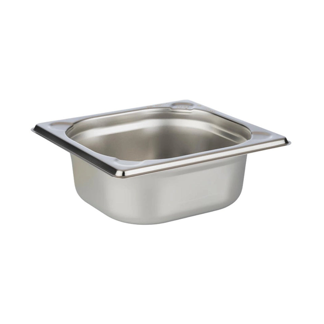 • حجم GN 1/6 (17.6 × 16.2 سم) بارتفاع 6.5 سم، يحمل 1 لتر.