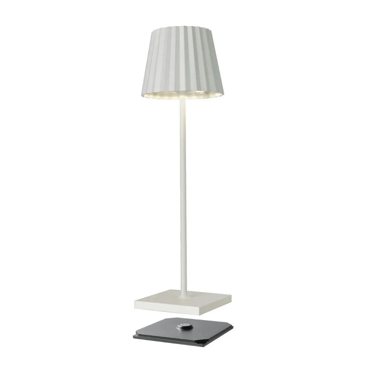 تروول 2.0 - مصباح الطاولة الخارجي مع الظل المميز المجعد. هذا المصباح الذي يعمل بالبطارية يبعث ضوءه لأعلى ولأسفل. لذا تستفيد من جهة من الضوء المباشر في المنطقة ومن جهة أخرى من الإضاءة غير المباشرة التي تساهم في خلق جو مريح.