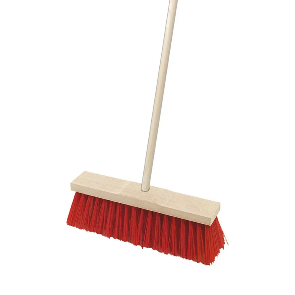Introducing the THS 46cm Street Broom, a versatile tool suitable for both indoor and outdoor use in various conditions, wet or dry. This brush is highly effective in removing heavy and solid litter such as shingle scraps, gravel, sand, and glass. It's perfect for streets, driveways, and parking lots, offering exceptional performance even on rough surfaces. The red-colored brush comes with a 46cm wooden handle, providing a comfortable grip and avoiding rust issues common with metallic handles.