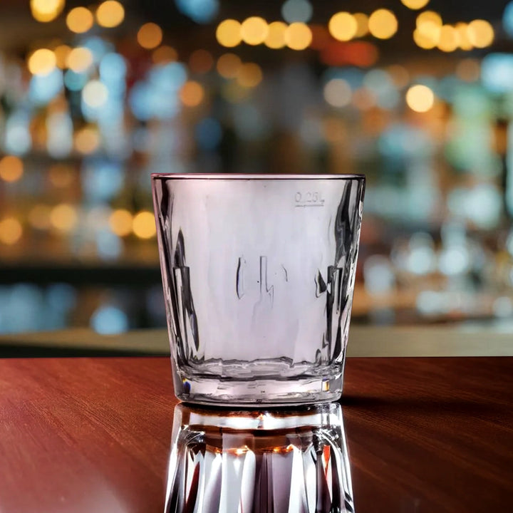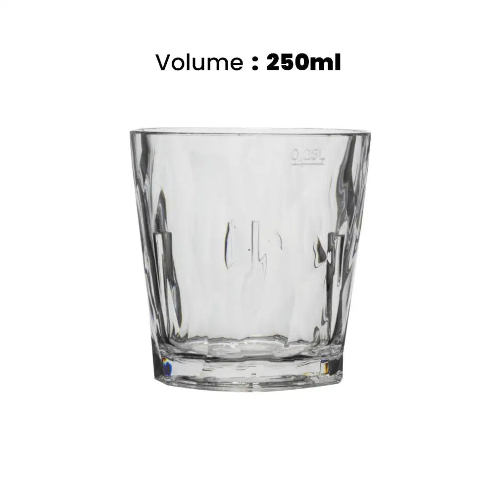 This Exclusive Diamont Tumbler 250ml, made of strong polycarbonate, is clear and resistant to breaking. With a 250ml capacity, it's excellent for single servings of beverages. In hotels, it enhances room service and minibar options. It elevates the presentation of specialty cocktails or desserts in restaurants, adding to the dining experience with its stylish design and durability.