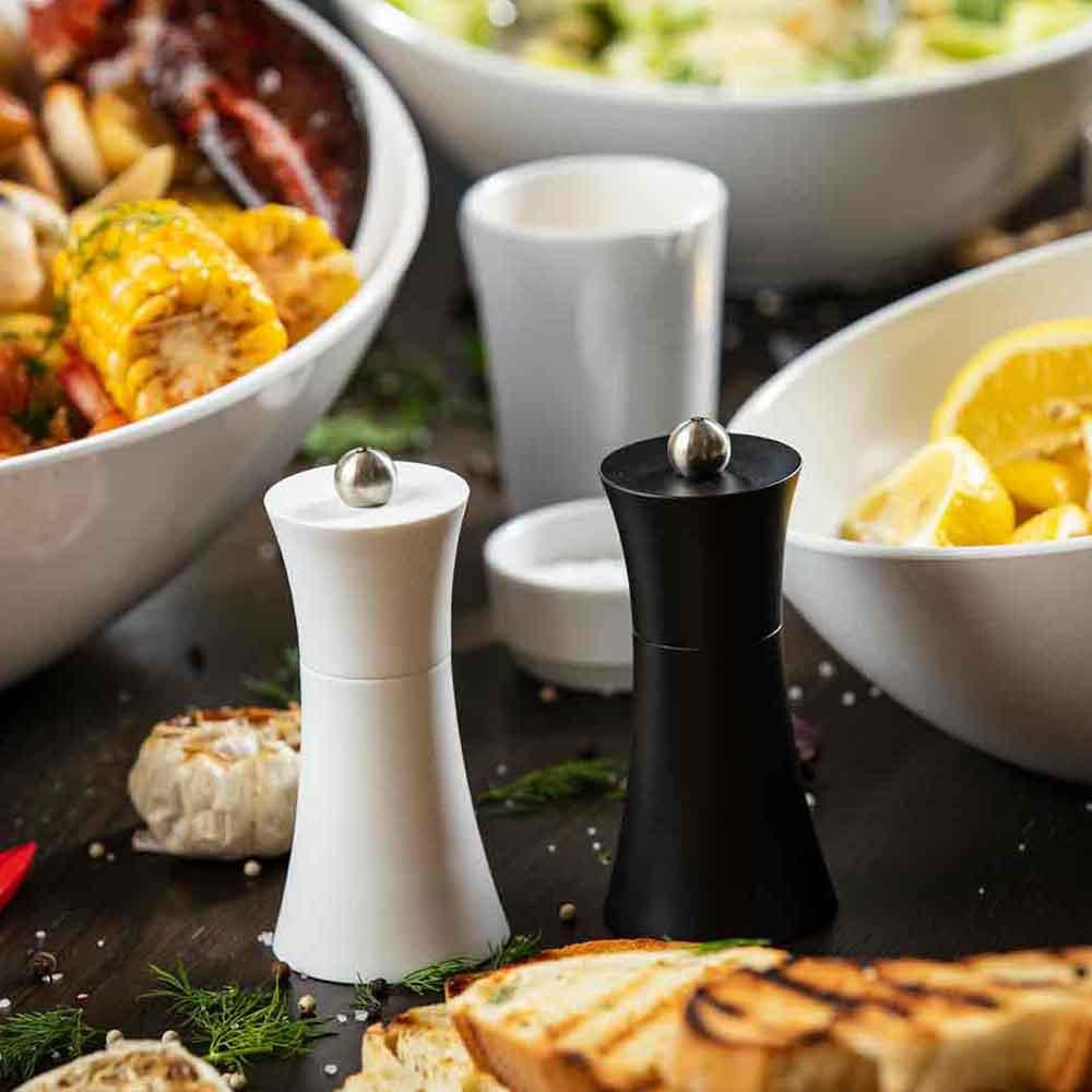 • تشتمل المجموعة متعددة الاستخدامات على مطاحن باللونين الأبيض والأسود لإضفاء مظهر أنيق وسهولة التعرف على الفلفل والملح