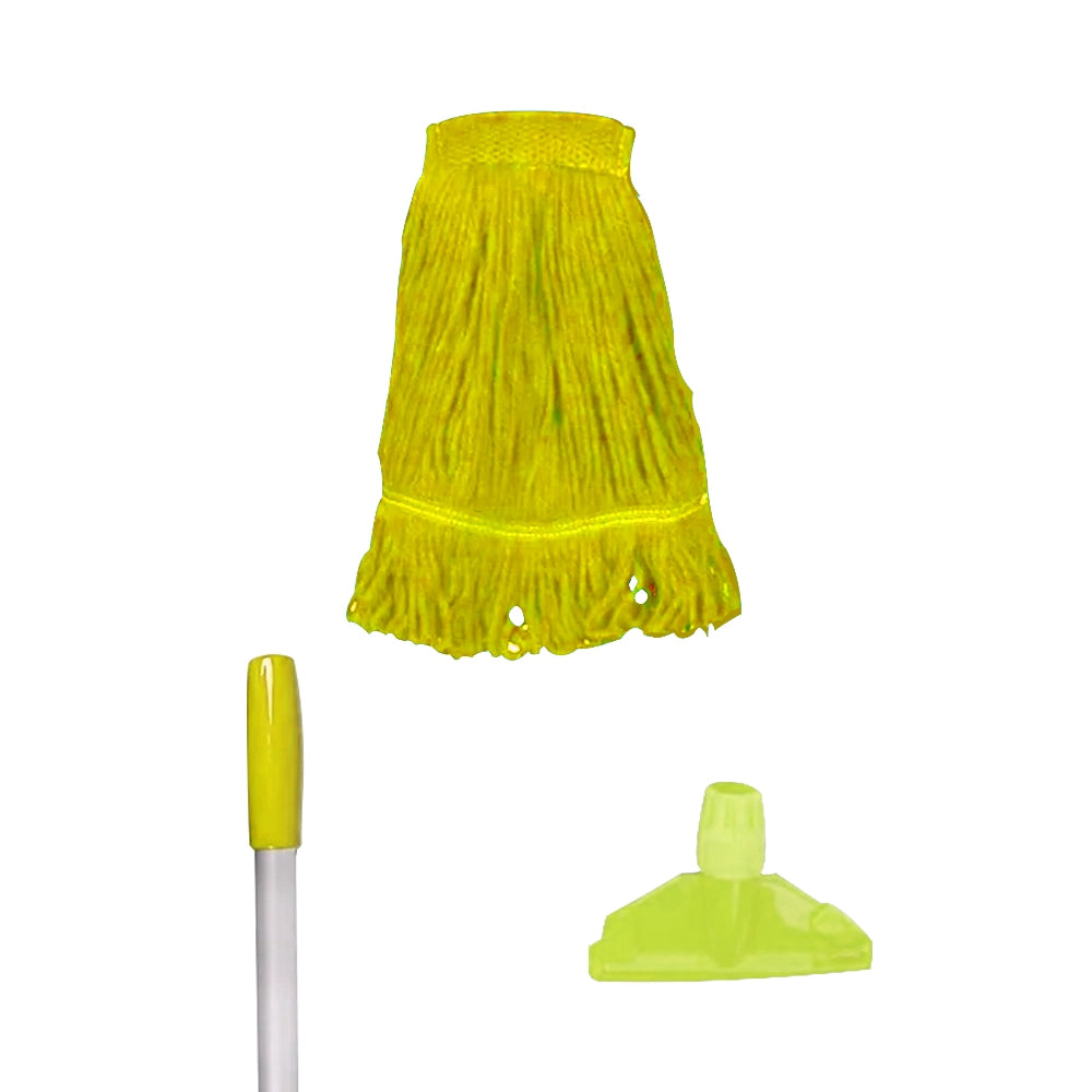 Introducing the THS Luxurious Wet Mop Set, designed for the hotel, restaurant, and catering industry. Crafted meticulously in China, this set features color-coded Kentucky mop heads in red, yellow, blue, and green for organized cleaning. The innovative abrasive scratchback center band effortlessly removes stubborn dirt, while high absorbency allows the mop head to soak up water up to four times its weight. Rapid drying technology reduces bacterial growth.