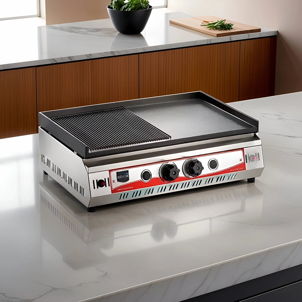 With the sturdy stainless steel Remta Gas Casting Grill, you can cook with outstanding range. Because of it's unique double-sided design, which is tailored to the exacting requirements of the hospitality sector, it may be used with both corrugated and flat cooking surfaces. Its effective design ensures consistent performance regardless of location and is compatible with both natural gas and LPG. Measurements: 70 x 51 x 22 cm. An indispensable tool for eateries, lodging establishments, and caterers looking for reliability and adaptability in their kitchens.