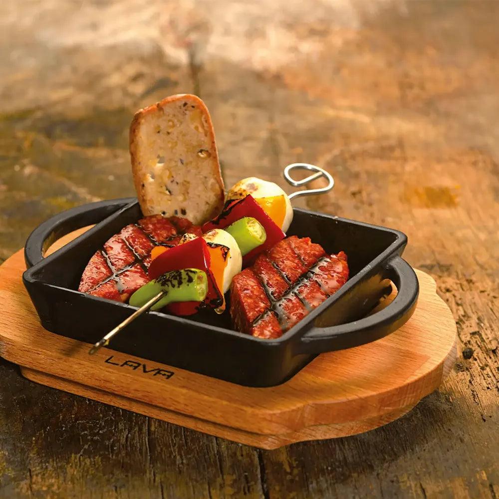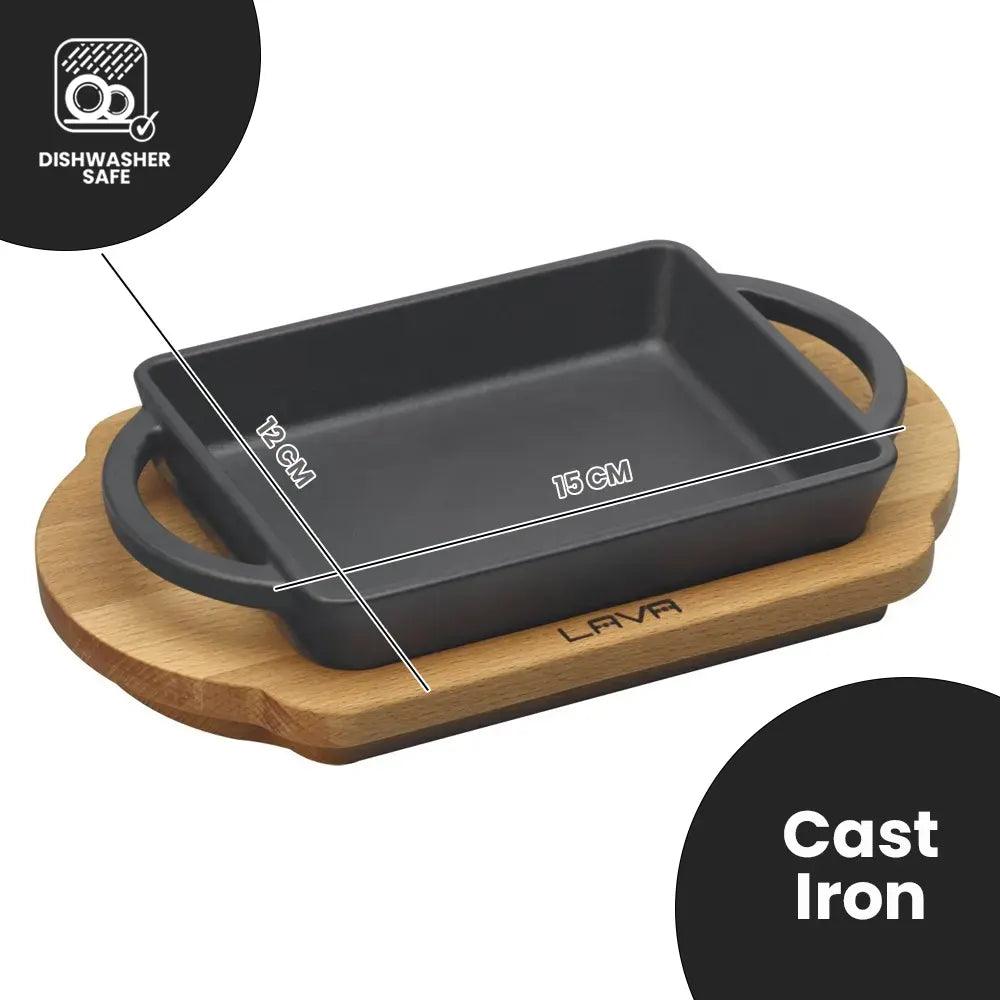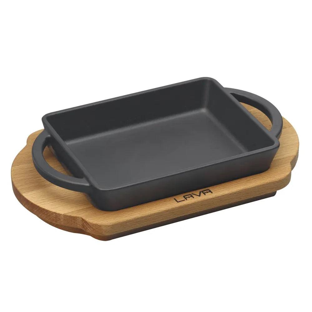 Lava Enameled Cast Iron Rectangle Service Dish With Wooden Platter, Black With Handle, 12 X 15 Cm - HorecaStore