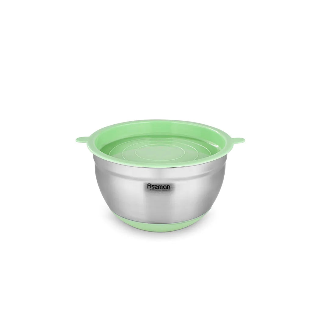 وعاء خلط من الفولاذ المقاوم للصدأ مع غطاء وقاعدة سيليكون مضادة للانزلاق، باللون الأخضر/الفضي، سعة 1.5 لتر.