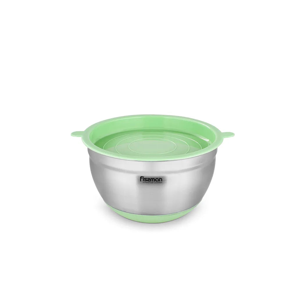وعاء خلط من الفولاذ المقاوم للصدأ مع غطاء وقاعدة سيليكون مقاومة للانزلاق، باللون الأخضر/الفضي، سعة 3 لتر.