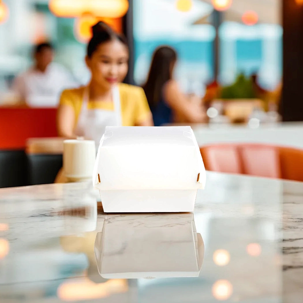 Hotpack's Large Printed Paper Burger Box is perfect for restaurants, food trucks, and events, adding a fun touch to meal presentation. Its sturdy construction keeps burgers secure during transport, and the grease-resistant material prevents messes. Ideal for serving big, juicy burgers with all the fixings, this box is a practical and vibrant choice for meal service.