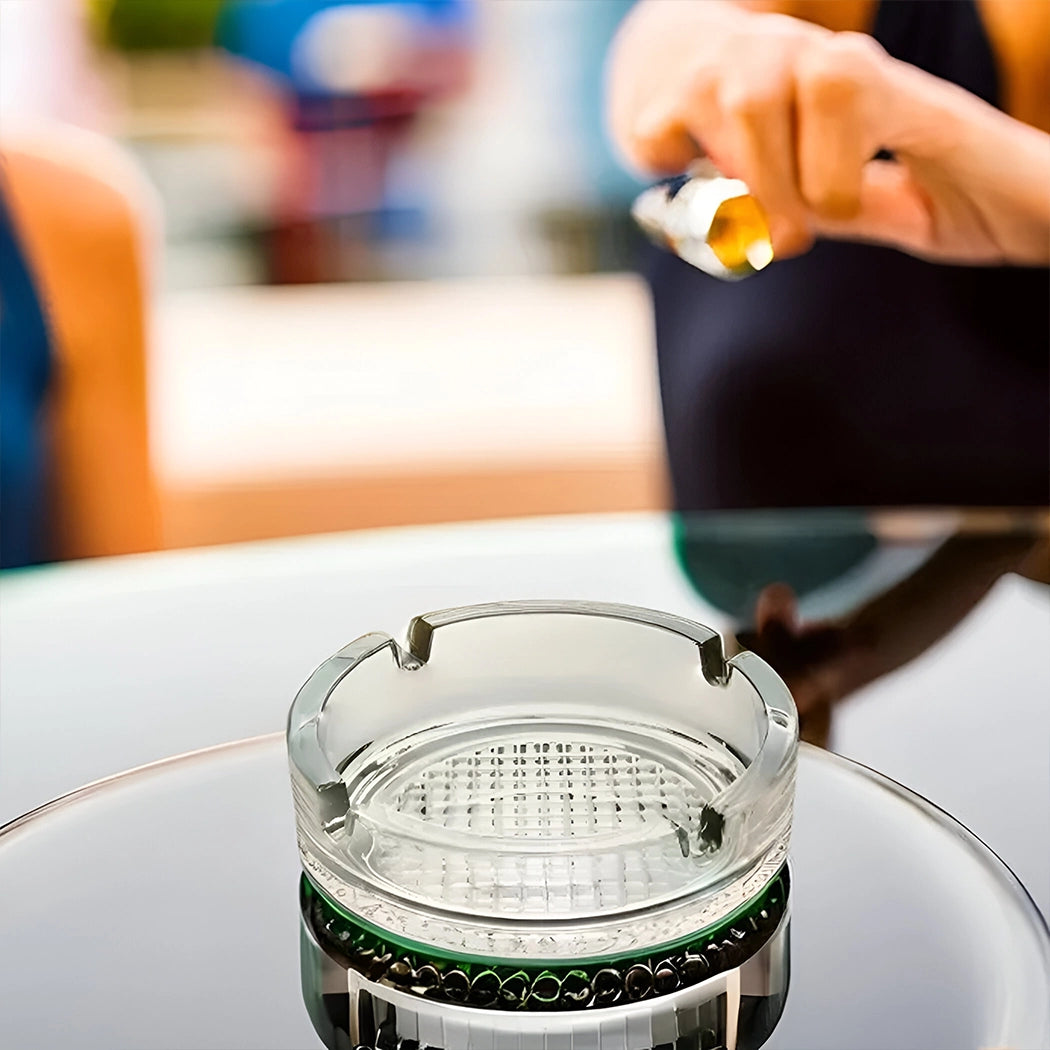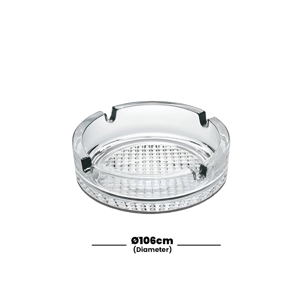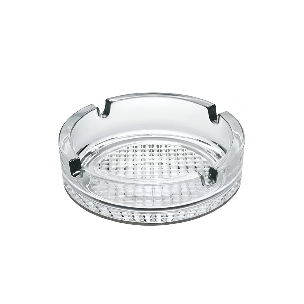 The Osz "Kruglaya (relief)" ashtray, 106 cm in diameter, is a substantial glassware piece designed for hotels and restaurants across Europe. Its transparent glass and decorative relief make it ideal for stylishly accommodating smoking areas. Packaged in sets of 24, it combines functionality with aesthetic appeal in hospitality environments.