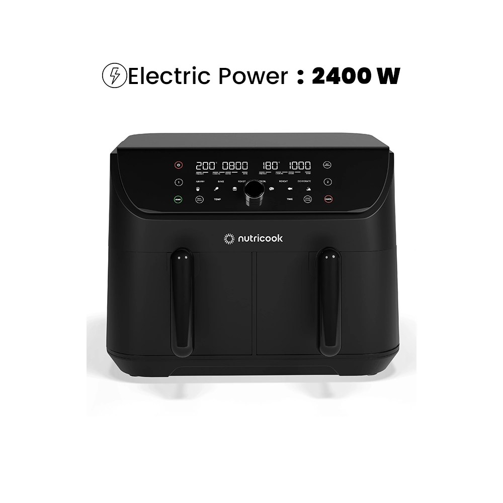 Introducing the 2400 W high quality mechanism Nutricook AFD185 2400W Dual Basket Air Fryer, your versatile cooking partner that effortlessly combines functionality and style. With its 8.5L capacity, divided across two 4.25L baskets, it empowers chefs in the hospitality industry to cook two dishes simultaneously, or manage different portion sizes with ease. Highlighting 12 cooking functions, including Air Fry, Roast, and Bake, it caters to a vast array of menu options. The Dual Cook and Sync Finish features ensure that both baskets produce perfectly timed dishes, enhancing kitchen efficiency. Additionally, its easy-to-clean, non-stick baskets guarantee a streamlined post-cooking process, making it a prized addition to any professional kitchen setting.