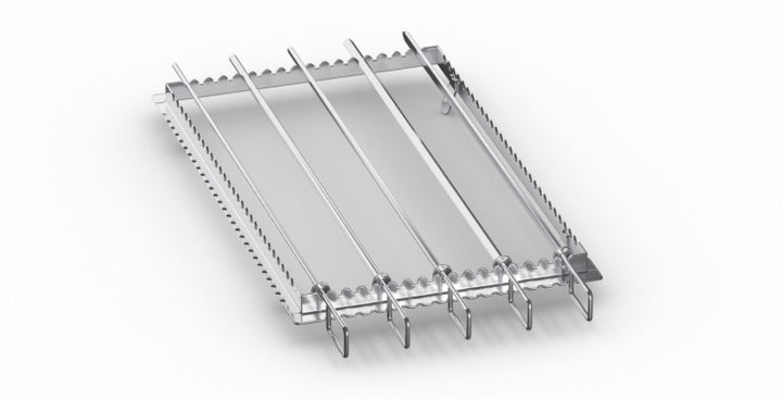 • High-grade stainless steel skewer and matching 1/1 GN skewer frame for grilling meat, poultry pieces, whole fish, or fillets