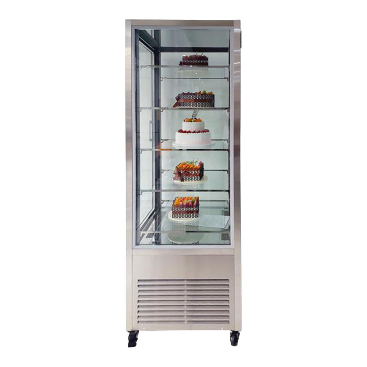 THS Cake Display is a stylish and modern refrigerated display case designed to showcase baked goods in a visually appealing way. With its 5 shelves and LED lighting, it provides a attractive display solution for bakeries, cafes, and restaurants. Features include a single door with a rear pulling handle, digital thermostat, and temperature control between 2-10°C. Constructed with high-quality stainless steel #304 and a white frosted glass door, ensuring durability and ease of cleaning. It offers efficient performance and reliable operation, making it an ideal choice for professionals in the food industry. Inspired by Swedish design and assembled in China, it's a reliable choice for showcasing cakes and pastries.