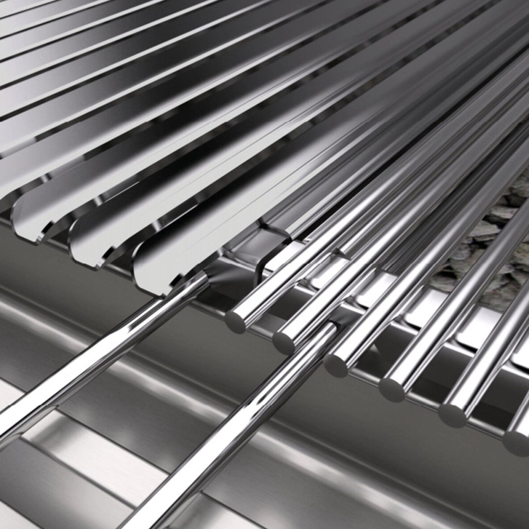 • High-power stainless steel burners provide efficient heating for lava rock grilling.