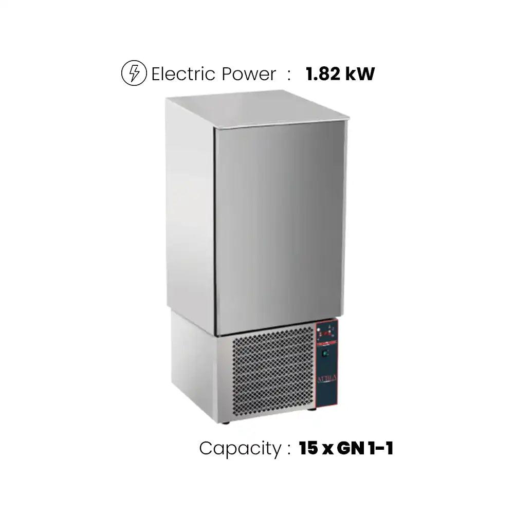 • Accommodates 15 x GN 1/1 trays for extensive food chilling. Powerful Cooling Operates at 1.82 kW for rapid and effective food chilling.
