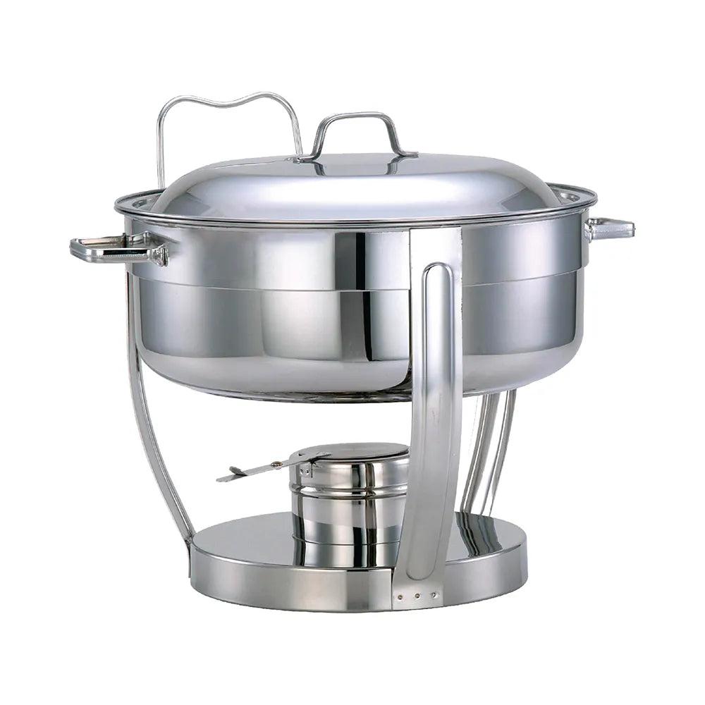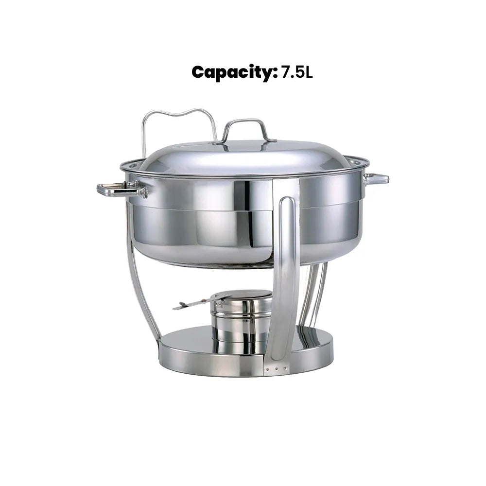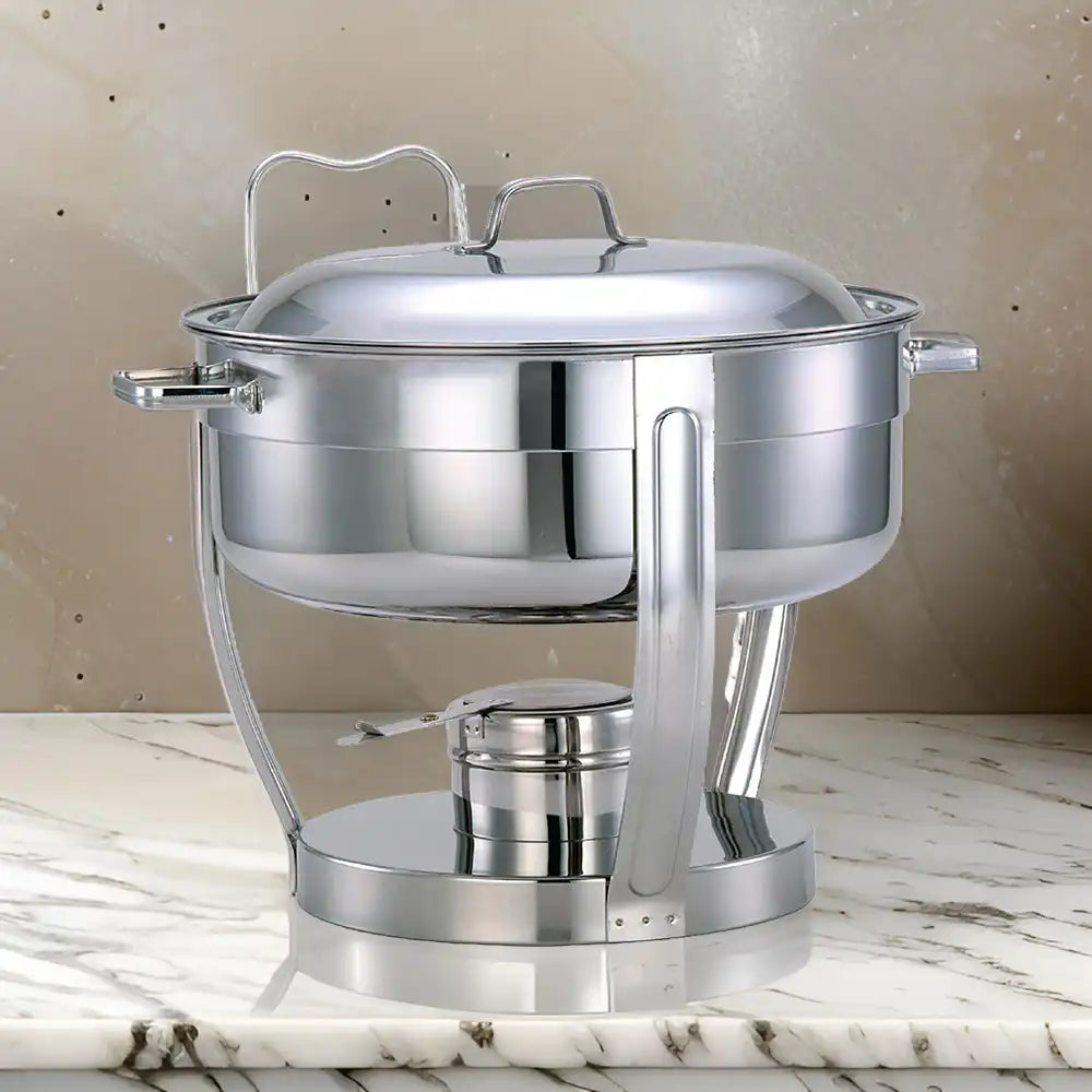 Designed with the hospitality industry in mind, the Pradeep 7500ml Stainless Steel Round Chafing Dish combines style with functionality to serve and keep food warm. It's crafted for durability and maintains a sleek look, ideal for a wide array of events. This chafing dish ensures food remains warm, making it perfect for everything from appetizers to main dishes, all while being easy to clean and maintain.
