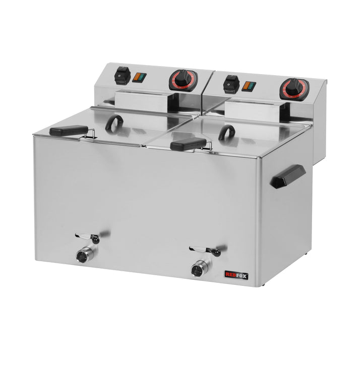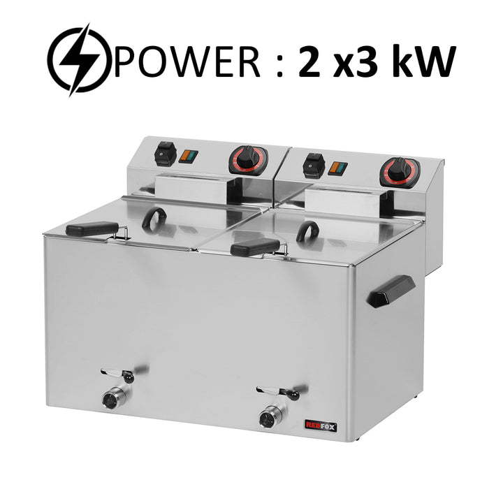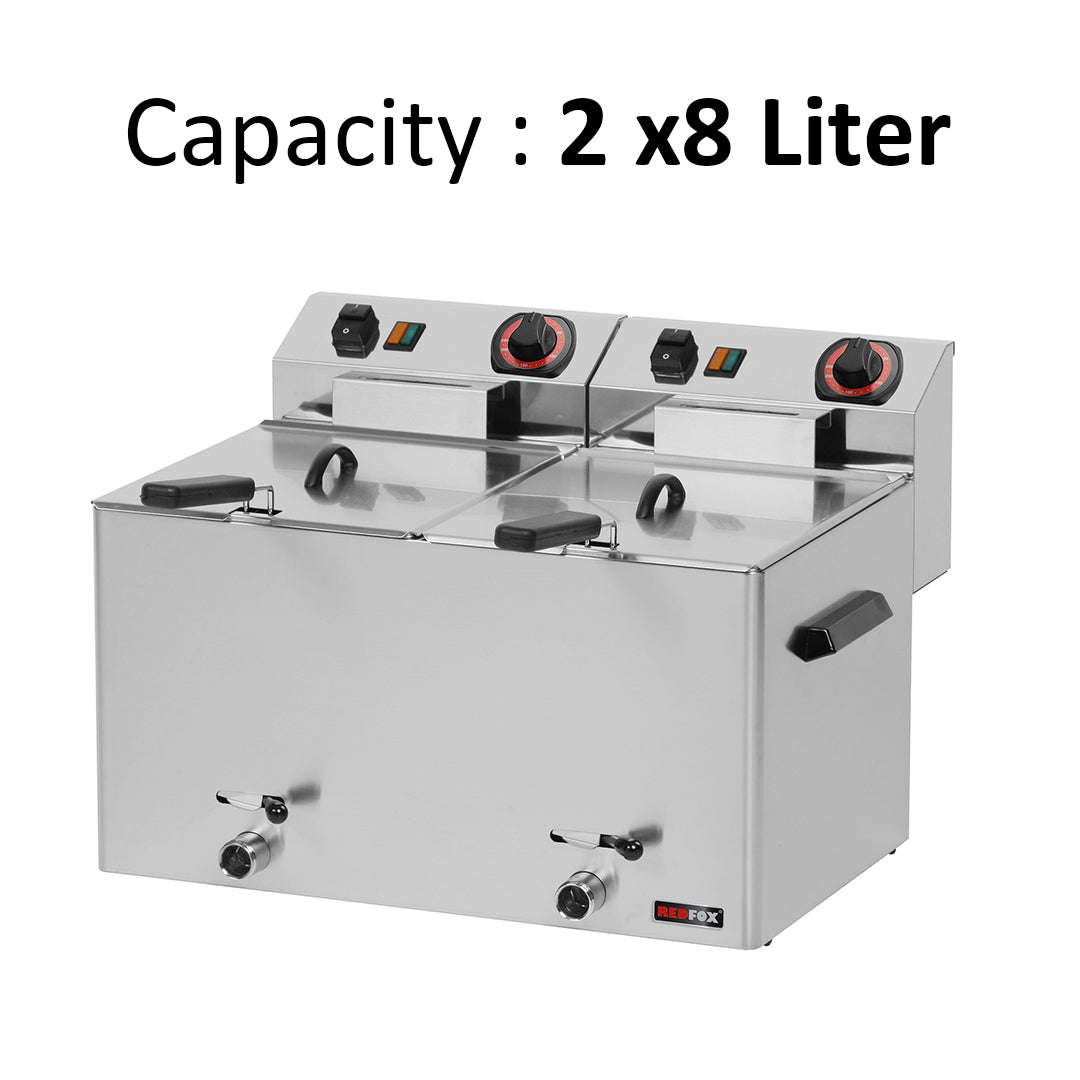 • Electric fryer with two baskets, each with a capacity of 8 liters, and an oil draining tap for easy oil removal.