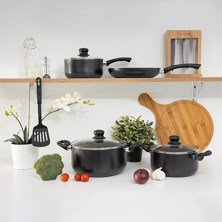 • Stylish and Modern Design: With its sleek, contemporary design, this cookware set adds a touch of elegance to any kitchen, making it both a practical and stylish kitchen accessory.