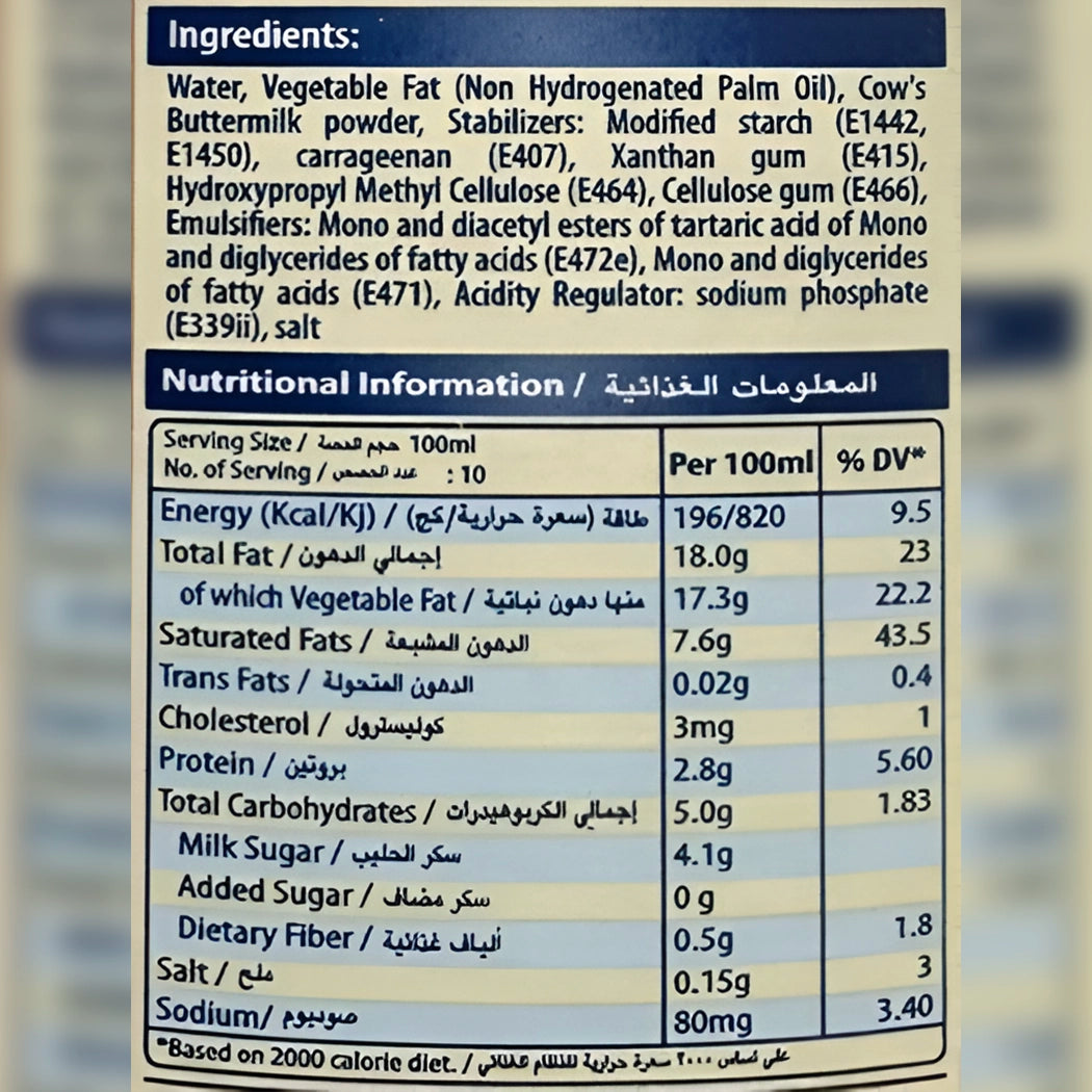 The cream guarantees a minimum fat content of 18%, ensuring richness and creaminess in culinary applications.