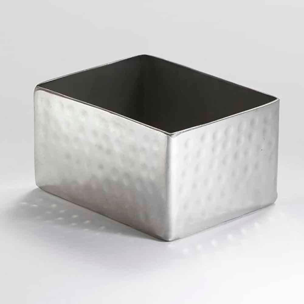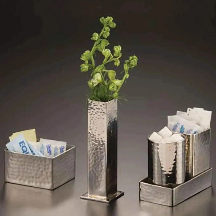 Elevate the dining experience in cafes, hotels, and restaurants with American Metalcraft's HMSPH4 Stainless Steel Square Hammered Finish Bud Vase & Sugar Packet/Cube Holder. The unique hammered finish adds a touch of sophistication to tables, seamlessly combining style and functionality. With precise dimensions of 8 L X 7 W X 5 H cm, this versatile piece enhances ambiance and efficiently holds sugar packets or cubes, making it a must-have for establishments that prioritize both aesthetics and practicality.