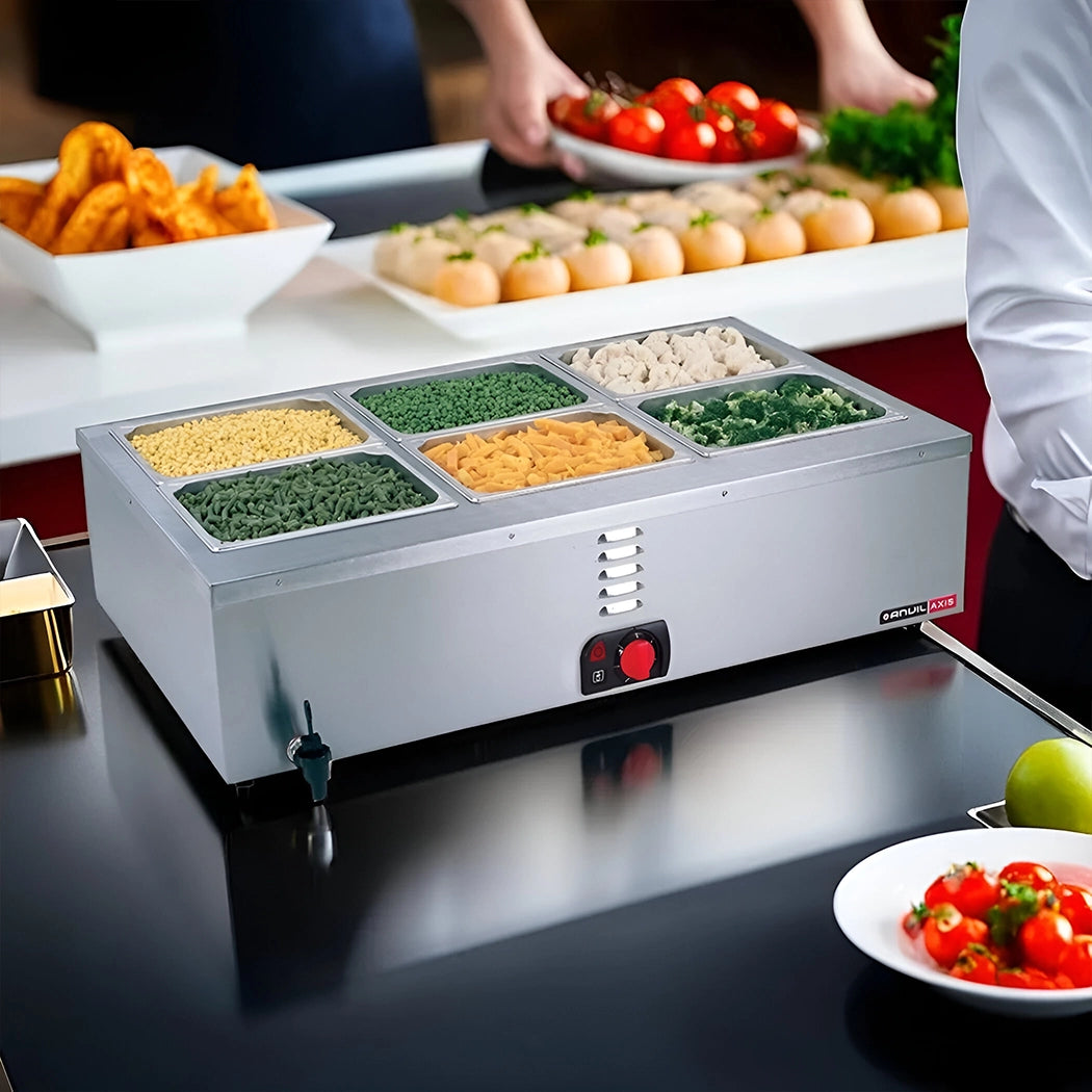 The Anvil Triple Division Electric Counter Bain Marie 2.7 kW is ideal for buffets, carveries, and catering. It features two compartments for versatile use, efficient heating, and a cool-touch double-skin stainless steel construction. Portable and easy to clean, it includes a convenient drainage tap and a power light for easy operation. Perfect for restaurants and outside caterers.