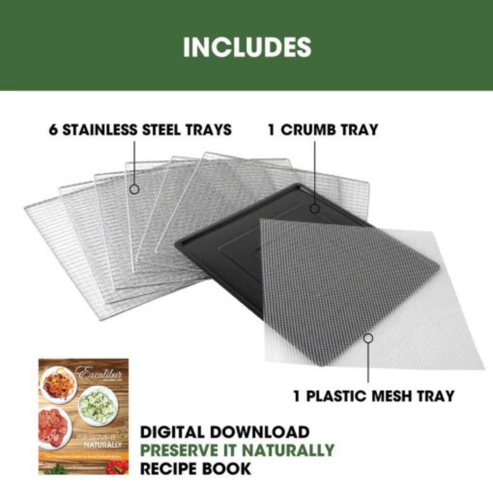 • 6 dishwasher-safe stainless steel trays provide 9.6 square feet of drying space.