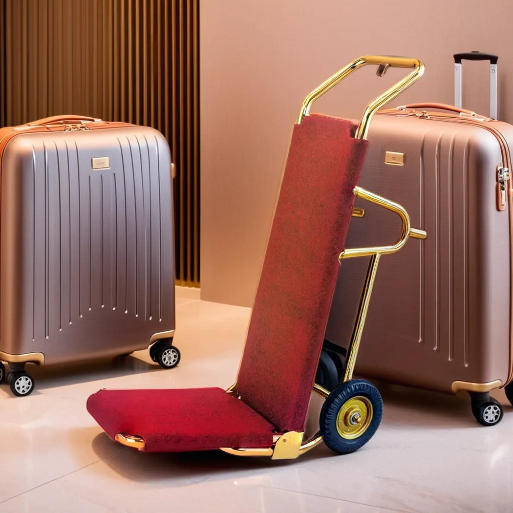 VM Classic Hotel Luggage Trolley Gold- 304 Stainless Steel Tube Ø50 mm, L 105 x W 65 x H 195 cm, Holds 1400 lb of Luggage Red Carpet