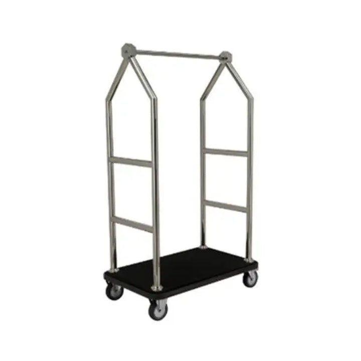 Elevate hotel luggage handling with the VM Group Hotel Luggage Trolley. Crafted from durable 304 stainless steel, it holds up to 1400 lbs. of luggage. The trolley features a luxurious polyamide velour carpet, shock-absorbent bumper, and 8" pneumatic wheels for smooth mobility. Ideal for seamless room relocations, it combines durability, style, and functionality, enhancing the guest experience.
