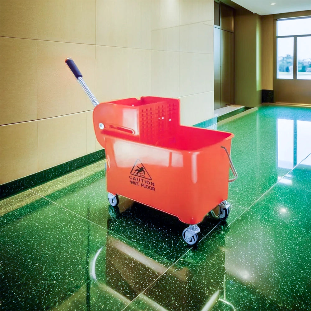 Introducing our Single Mop Bucket Trolley, featuring a 20-liter capacity and available in Red, Blue, Yellow, and Green colors. Designed for use with Microfiber and Kentucky mops, it includes 'Caution Wet Floor' signage for safety. The metal wire handle facilitates easy lifting and emptying, while the 360-degree rotation wheels ensure smooth mobility. With a strong and durable design, it's perfect for maintaining hygiene in hotels, restaurants, and cafes.