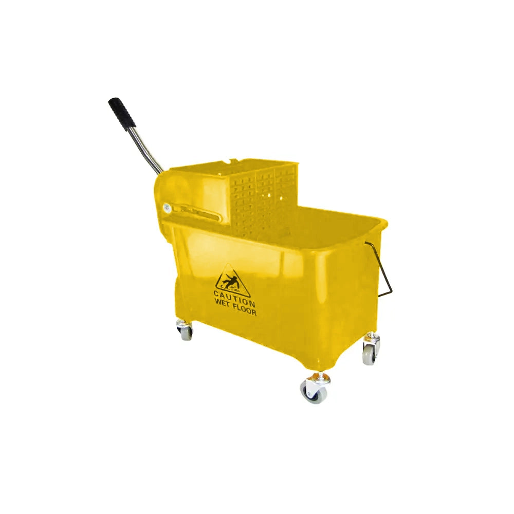 Introducing our Single Mop Bucket Trolley, featuring a 20-liter capacity and available in Red, Blue, Yellow, and Green colors. Designed for use with Microfiber and Kentucky mops, it includes 'Caution Wet Floor' signage for safety. The metal wire handle facilitates easy lifting and emptying, while the 360-degree rotation wheels ensure smooth mobility. With a strong and durable design, it's perfect for maintaining hygiene in hotels, restaurants, and cafes.