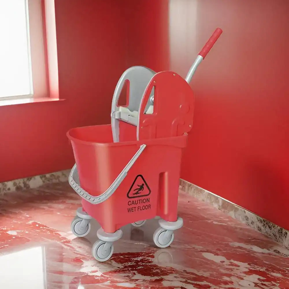 Introducing our Single Mop Bucket Trolley with a 22-liter capacity, available in vibrant colors like Red, Yellow, Blue, and Green. This trolley features a down-press mechanism for efficient mop drying and a durable engineering plastic gearing system for strength. It includes a roller with protective bumpers, an ergonomic design for operator comfort, and compatibility with various mop types. Ideal for hotels, restaurants, and cafes, providing a convenient and versatile cleaning solution.
