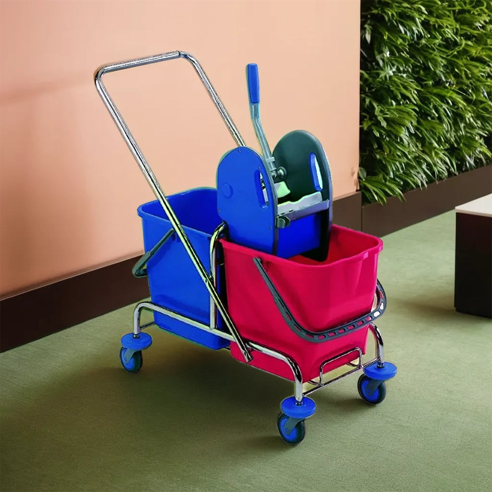 Introducing our Double Mop Bucket Trolley, a robust cleaning solution designed for hotels, restaurants, and cafes. With a 50-liter capacity and chrome steel/polypropylene copolymer construction, it features red and blue 25L buckets for separate cleaning and rinse water. The trolley boasts an efficient Down-Press Wringer, 80mm swivel castors with anti-shock technology, and a reversible handle, ensuring ease of use and maximum hygiene while saving water and labor