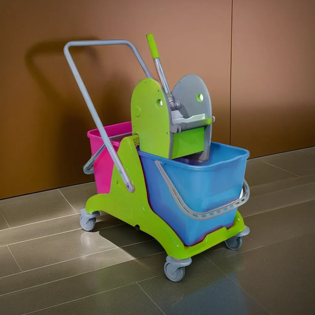 Introducing the Tristar Double Mop Bucket Trolley with a generous 50-liter capacity, available in striking colors like Blue, Green, Orange, and Yellow. This trolley features two removable 25-liter buckets that fit securely into the frame with wheels and a handle for effortless maneuvering. The integrated mop wringer between the buckets ensures efficient water removal, making it a convenient and practical solution for cleaning tasks in hotels, restaurants, and cafes.