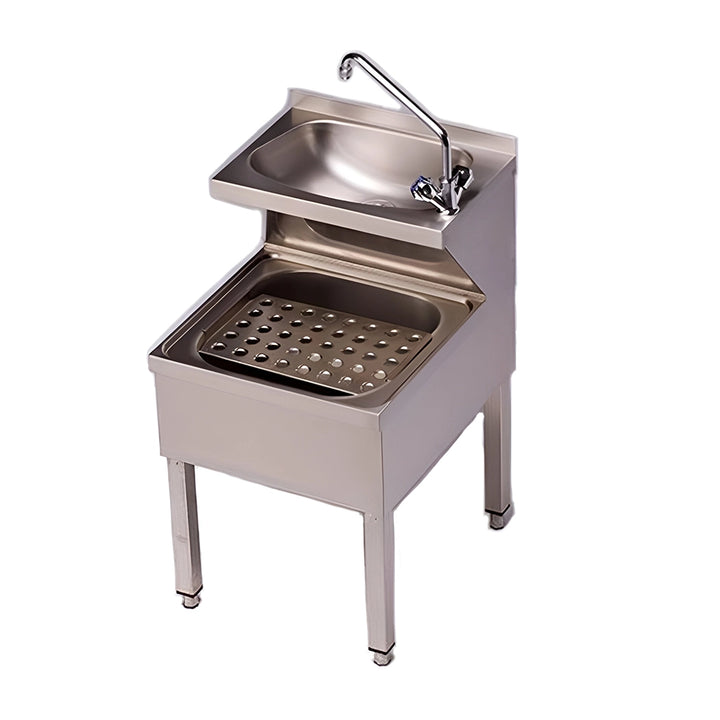 The THS Mop Sink with Hand Wash is a convenient and practical solution for cleaning and hand washing, ideal for commercial and industrial environments. It features a single water tap, drain gutter with overflow, and height-adjustable plastic feet for easy installation. Constructed from high-quality stainless steel, it ensures durability and ease of cleaning. Made in Turkey by MTS, it includes a water mixer or sink accessories for added functionality.