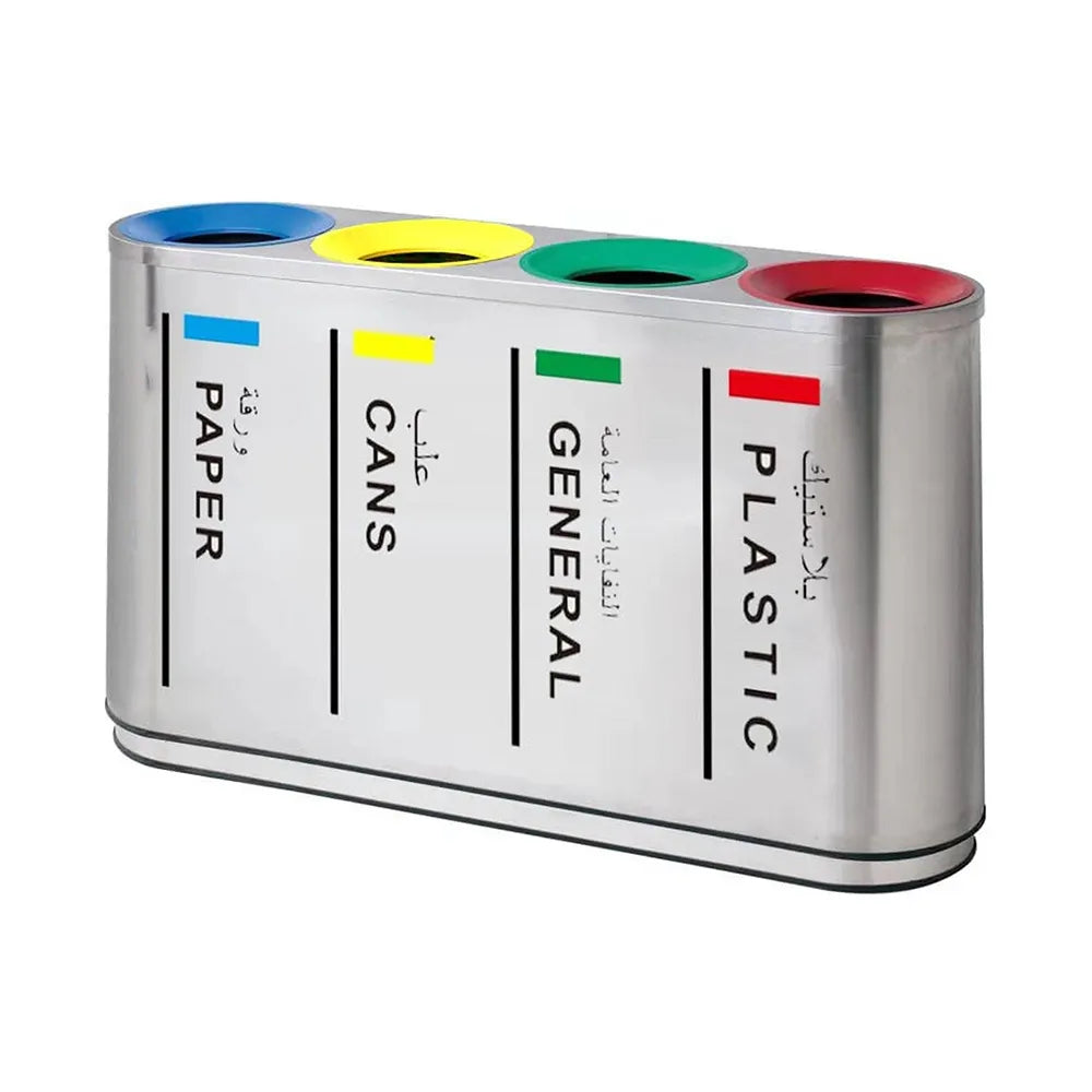 Introducing the THS 4 Compartment Recycle Bin Stainless Steel Coated, a versatile solution for indoor recycling needs in hotels, restaurants, and catering facilities. With customizable colors and finishes, it seamlessly fits various environments. Its oblique top open mouth design, silk-screened recycle signs, and black recessed skirting ensure functionality and aesthetics. The hinged body and lid with a chain/lock system simplify cleaning and maintenance, making it an ideal choice for sustainable waste management.