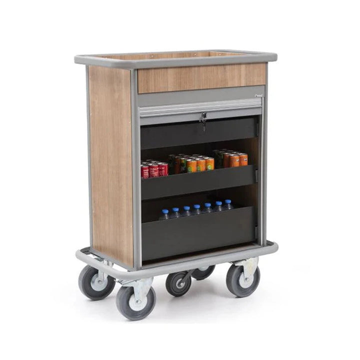 VM Signature Minibar Trolley L 101 x W 59 x H 128 cm, 3 Stable Drawers, Lockable Plastic Roller Panel, Beechwood