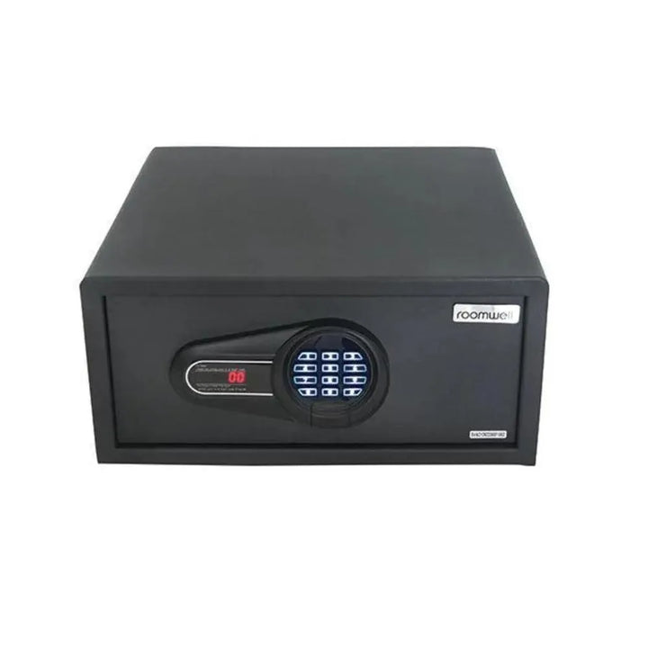 The Roomwell UK Premium Small Safe Box, a sleek and robust security solution. Crafted with a laser-cut curved body, 20 mm solid locking bolt, and durable steel construction, it ensures protection for valuables. Enjoy modern convenience with the digital lock and monitor access with 300 audit records. Its stylish black color complements any setting. Ultimate security and style combined.