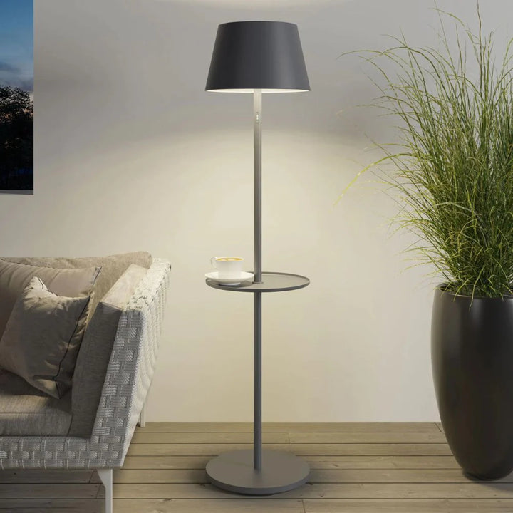 The GARCON outdoor luminaire made of high-quality aluminium is not only practical with its movable table, but also always creates the perfect mood! You decide on the desired light intensity and 9 light colours via the touch sensors. A special feature: The battery lamp can be assembled in 3 different heights, so that the GARCON fits every situation. Thanks to the IP65 protection class, the floor lamp can be used both indoors and outdoors. Charging station included.