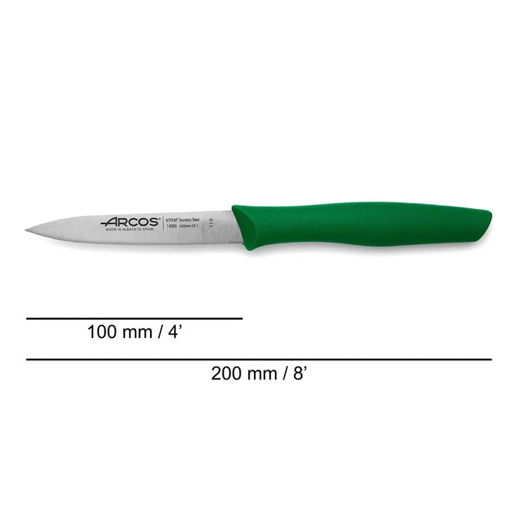 Elevate your culinary skills with the Arcos Paring Knife 4 Inch Stainless Steel, a must-have for every home chef. This professional kitchen knife is designed for precision peeling of fruits and vegetables, featuring an ergonomic polypropylene handle and a 100 mm long blade in a vibrant green hue. Unleash your inner chef and upgrade your kitchen arsenal with this stylish and versatile tool.