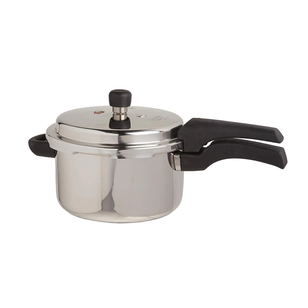 • Prestige stainless steel pressure cooker, 4-liter capacity.