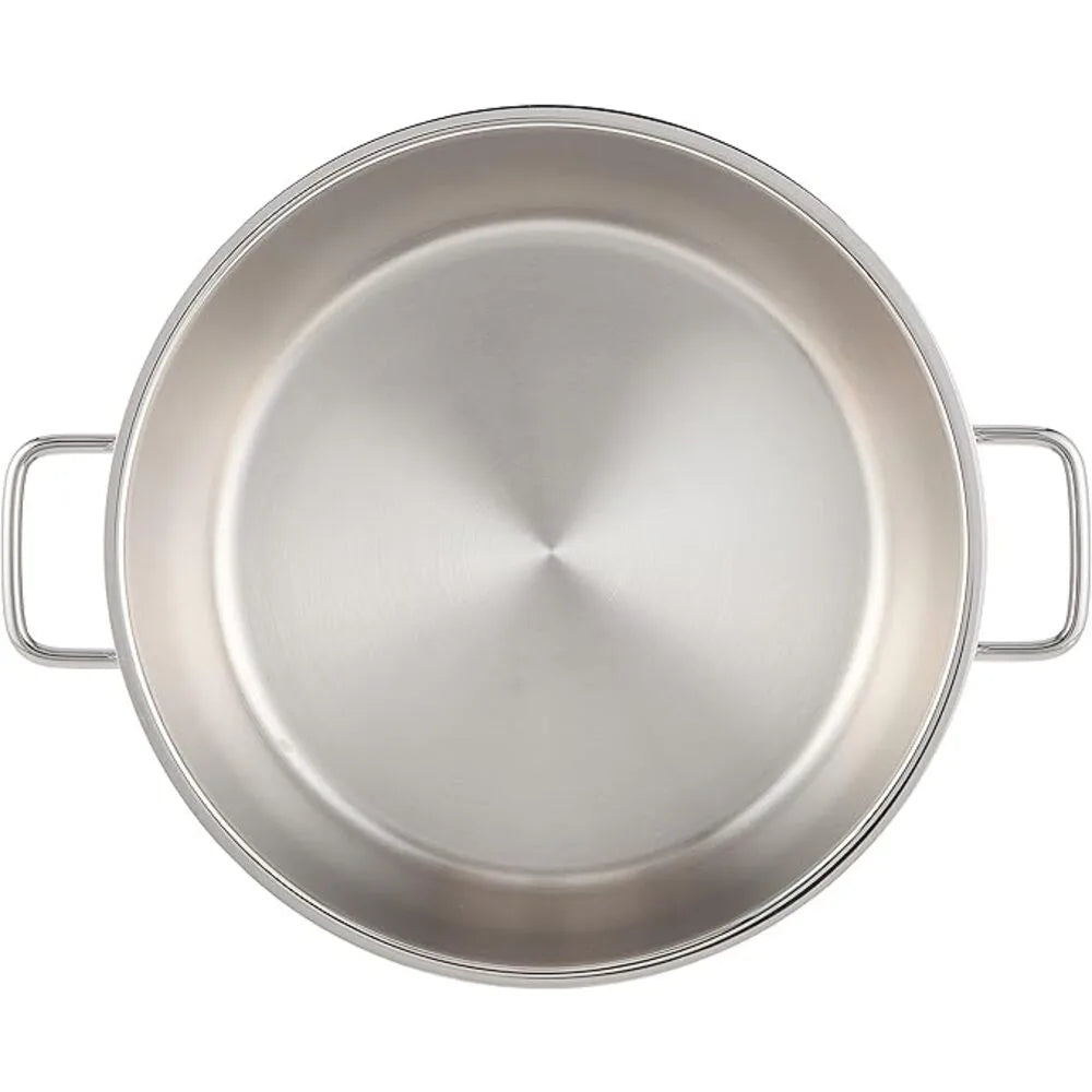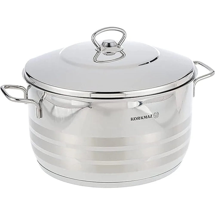 The Korkmaz Astra Stainless Steel Casserole, sized at 26x15 cm with an 8-liter capacity, is ideal for the hospitality industry. Made in Turkey from 18/10 stainless steel, it offers a hygienic and long-lasting cooking solution. Its triplex heavy bounded capsule bottom ensures even heat distribution, enhancing cooking performance. The high polished exterior adds elegance, while the stainless steel handle provides a secure grip. Perfect for professional kitchens, this casserole combines functionality and style, making it a valuable addition to any culinary setting.
