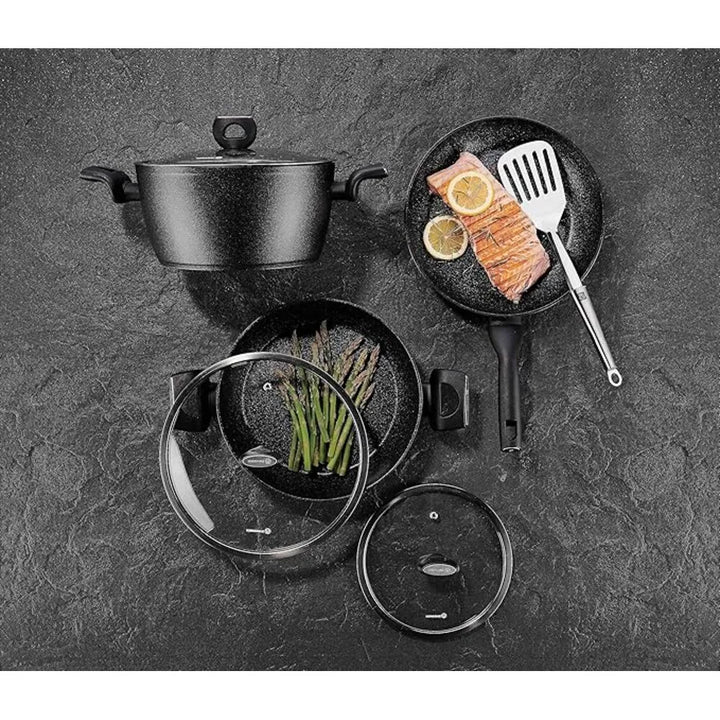 The Korkmaz Nora Granite Casserole (28 cm x 13.7 cm, 7.2 liters) is designed for the hospitality industry. Made from aluminum with a non-stick granite coating, it offers exceptional durability and performance. The superior German technology ensures effective cooking even at low temperatures, while the environmentally friendly materials reduce oil use. Perfect for slow-cooking, this casserole provides a vibrant multicolour finish and excellent resistance to scratching.
