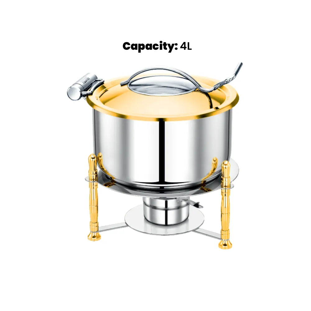 Designed for the hospitality industry, the Pradeep Elegant Chafer offers an exquisite gold finish and a substantial 4-liter capacity, perfect for luxurious-event catering. Crafted with high-quality stainless steel, it blends durability with a timeless appeal, making it an ideal choice for hotels, restaurants, and catered events. Its heat retention capabilities ensure dishes remain warm, enhancing guest satisfaction. Easy to clean, it promises long-lasting service, adding a classic sophistication to any table setting.