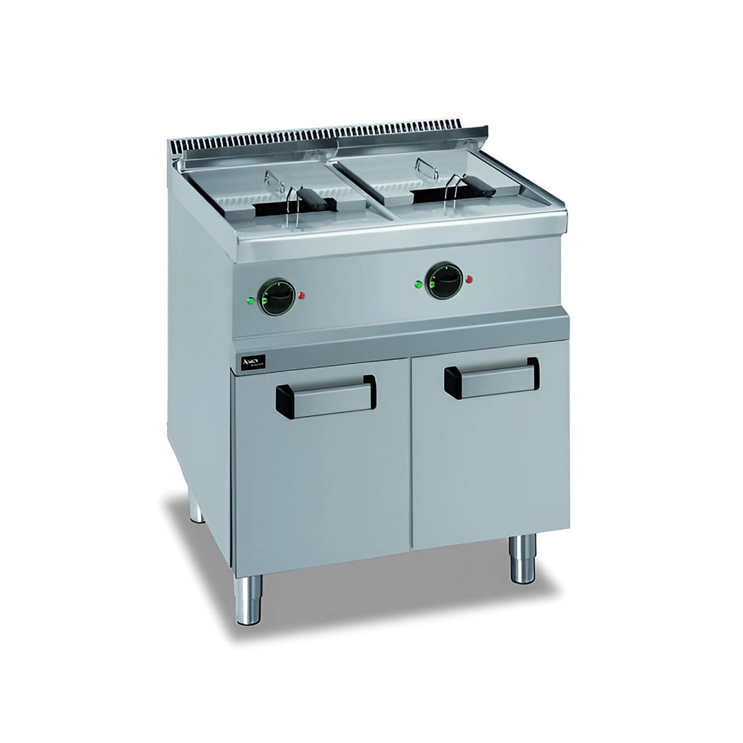 The APACH 700 Series Electric Fryer APFE-77P/PL is suitable for hotels and restaurants, with its two 13-liter stainless steel tanks. It has a temperature range of 90 to 190 °C with electromechanical controls, including a thermostat and timer. Features chrome steel wire baskets, stainless steel covers, and a closed cabinet base with adjustable feet for stability.