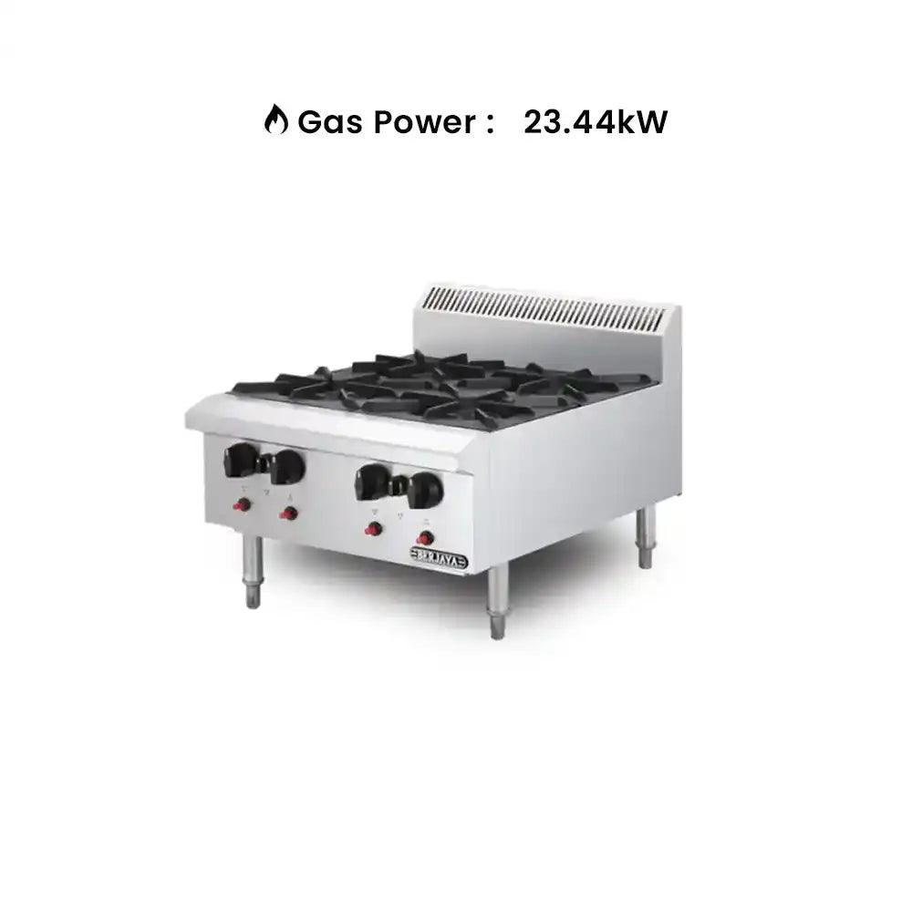 • Four open burners with a powerful 23.44KW total gas power output.