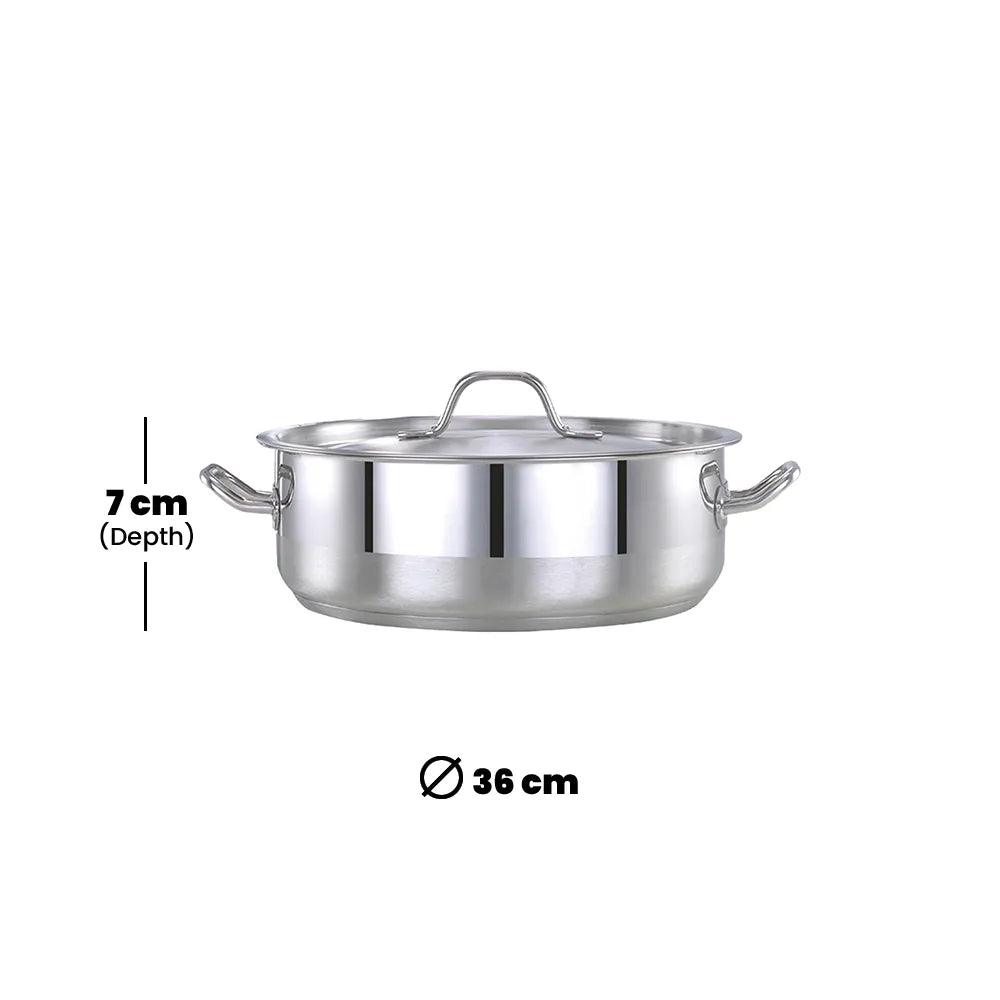 Designed for the demanding needs of the hotels, restaurants, and catering industries, the Pradeep Professional Cookpot offers a blend of durability and functionality. Crafted from high-grade stainless steel, this cookpot, featuring a silver finish, 36cm diameter, and 7cm height, brings both elegance and efficiency to professional kitchens.