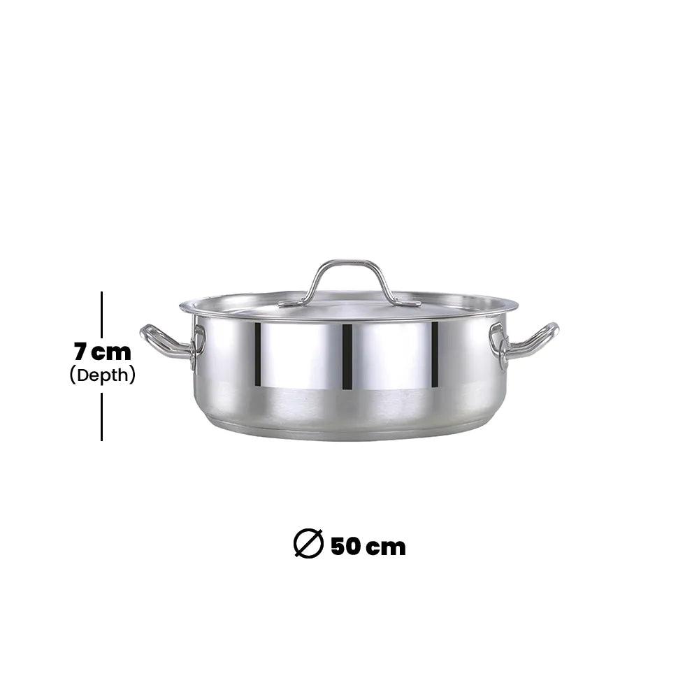 • Measures 50cm in diameter and 7cm deep, ideal for various cooking methods.