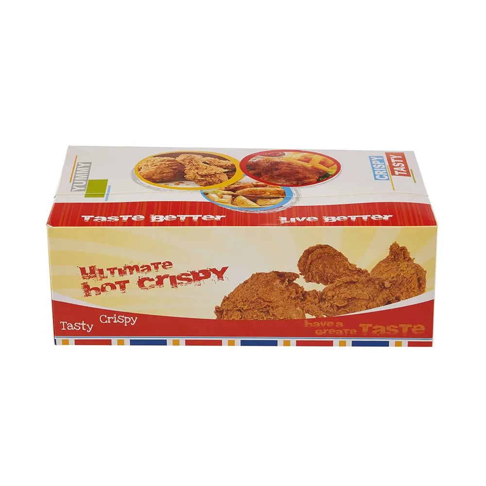 This coloured take-out dinner/chicken box with a tuck top is ideal for restaurants, cafes, delis, and caterers. Its grease-resistant design minimises messes, while the bright exterior allows for endless options. It's perfect for serving a full catered meal, from piping hot fried chicken to cold sandwiches and baked goods.