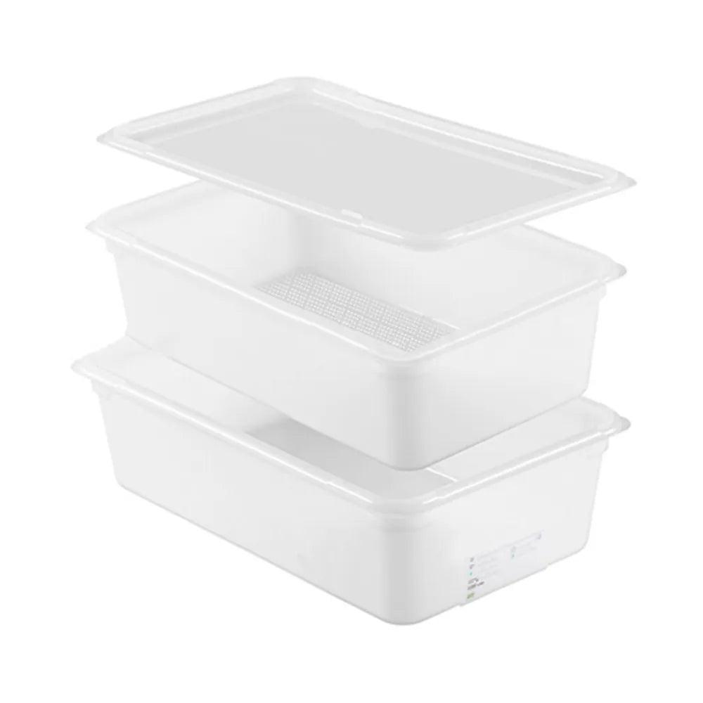 Introducing Defrost Kit from Araven, designed to streamline the defrosting process in your kitchen. Engineered to facilitate faster thawing, especially for meat and fish, it features drainage holes to prevent liquid accumulation. Removing original packaging is advised for optimal results. The perforated box fits neatly into another, minimizing dripping and cross-contamination. Simplify your defrosting routine and ensure efficient food preparation with our innovative kit.