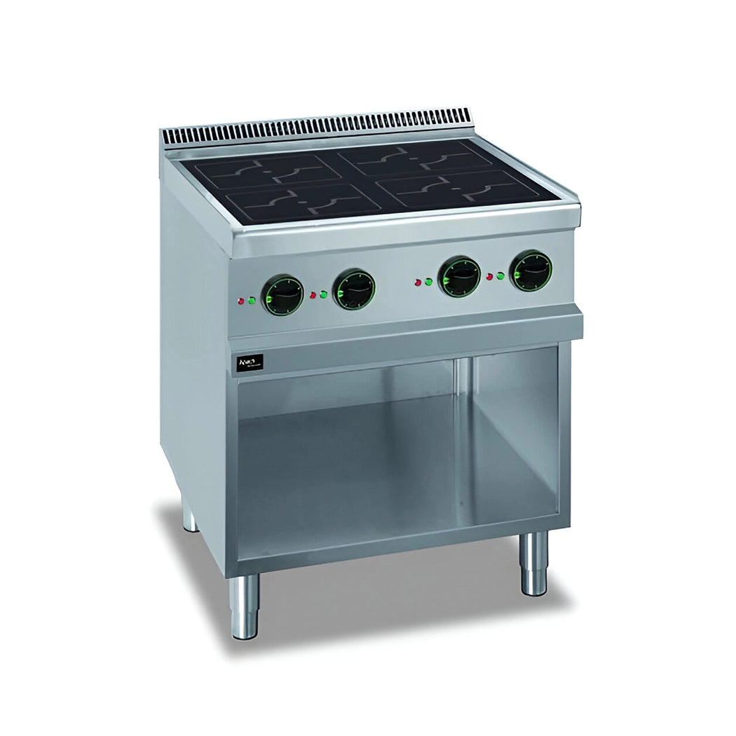 The APACH 700 Series Induction 4-Zones APRI-77P/PL is intended for efficient cooking in hotels and restaurants. It has four individually controlled heating zones with six power settings and can accommodate a variety of pan sizes (12-24 cm). The unit features LED indications and an open cabinet base with adjustable feet for stability.